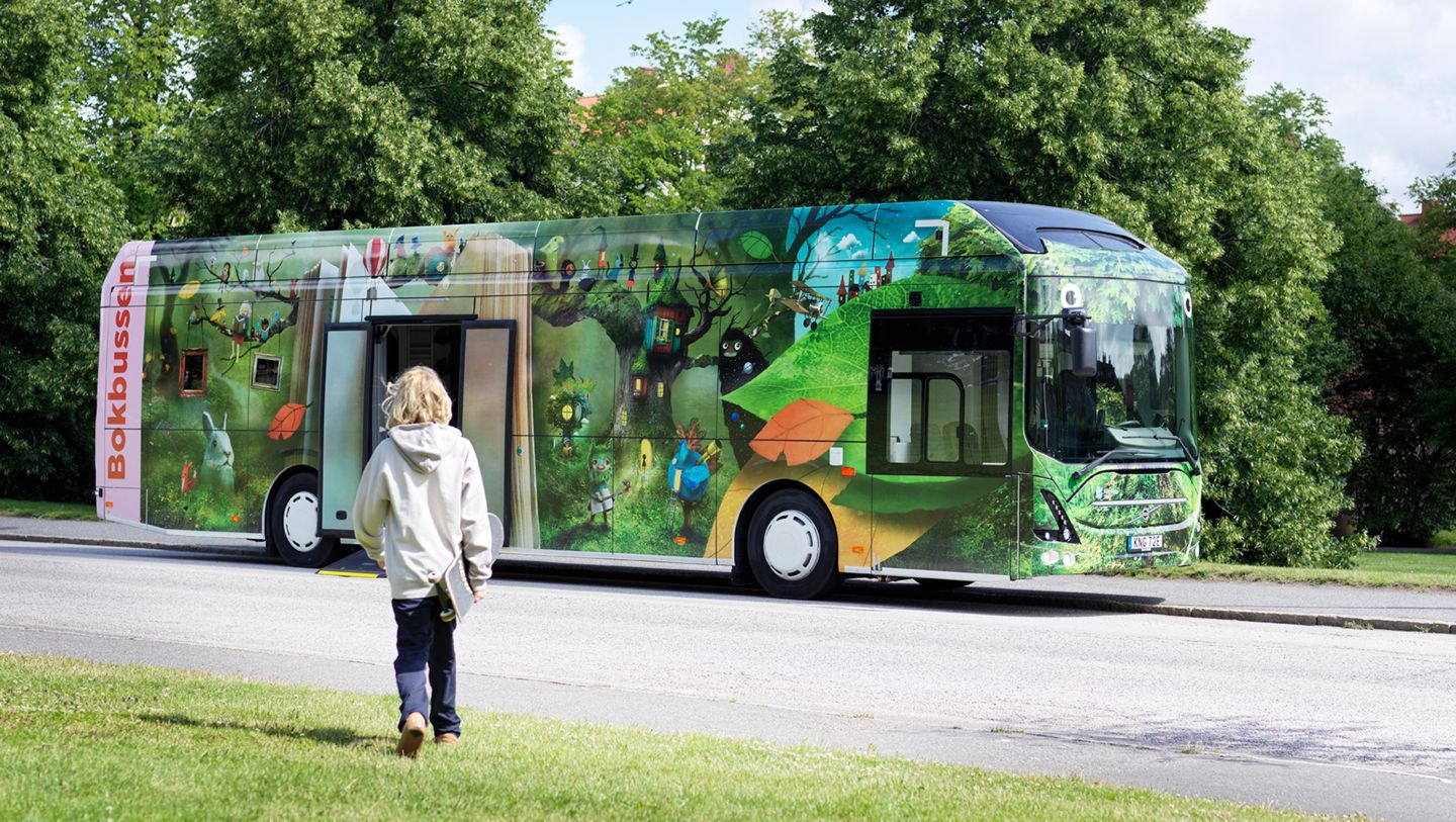 The buses, which are Sweden's first electric mobile libraries, are Volvo 7900 Electrics. Energy consumption is about 80 percent lower than the corresponding diesel bus. Since electric buses are both emission-free and quiet, they can be used in zero emission zones for extended periods of time. They also create other opportunities, such as being able to drive into shopping centres for book and family events.